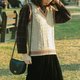 /已無法辨識 /V領,整體針織密度較鬆,領口及袖口藍色花滾邊,幾處毛線線頭脫出(可運用鉤針塞回,勿用剪刀) /材質標已遺失無法辨識