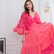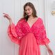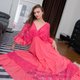 V領長洋裝,採用100%純棉材質,綴以精緻的蕾絲蝴蝶袖,層層荷葉邊設計,營造出甜美飄逸的垂墜感。腰部為鬆緊設計,裙身則由五層拼接布料構成,並飾有細膩的蕾絲,整體散發著溫柔的氣息,且帶有適度的份量感。 尺寸:胸圍FREE SIZE,腰圍FREE SIZE (可至50吋),臀圍FREE SIZE (可至52吋),全長54吋。