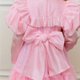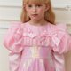 泡袖、让脸庞更明亮的大荷叶边、饱满的 A 字裙摆,以及腰间的大蝴蝶结,营造出小公主们最喜爱的完美轮廓。荷叶边边缘采用 皮科刺绣 收边,而非普通缝制工艺。
