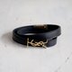 介紹這款YSL SAINT LAURENT 黑色 YSL 金色LOGO真皮雙圈磁石開口扣,這是一款時尚配件,輕鬆結合了奢華與功能性。此手環全新未使用,附帶原裝包裝盒、黑色塵袋及原裝卡,是送禮或添加到您的奢華收藏的完美選擇。