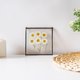 這款手工製作的植物相框,以六朵精心壓制的真雛菊為靈感,精心保存於玻璃板之間,並以深色金屬相框裝飾。雛菊在許多文化中像徵著純真、和平和新的開始。