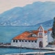 希臘令人印象深刻的地標 - 科孚島上的帕納吉亞弗拉赫納修道院 - 周圍環繞著藍色的大海,以雄偉的山脈為背景。