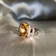 優雅美麗的雞尾酒戒指,採用來自緬甸的肉眼可見的飽和火金黃色明亮橢圓形切割黃水晶。 20 年前,我們購買了這顆寶石,並與台灣台北的家庭金屬匠一起製作了這枚戒指。其活潑的光芒和獨特的設計值得添加到您的收藏中,並且可以輕鬆搭配您的休閒牛仔布派對服裝。