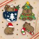 這款刺繡貼紙將杯子、可可奶油、聖誕葉與水豚表情細緻呈現。背膠可直接使用,也可縫在布面上: