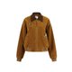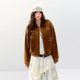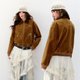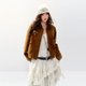 【設計說明:正肩麂皮絨底特律風短夾克外套/采用麂皮絨面料特,質地柔軟細膩,透氣保暖。燈芯絨翻領設計不僅散發懷舊氣息,更能巧妙修飾頸部線條。創意花朵搭配立體釘珠工藝,讓花瓣層次分明、立體感爆棚,成爲吸晴亮點。再以繡花log0點綴,精准聚焦視覺重心,整體將複古質感與精致工藝融合,兼具造型感與細節魅力。】