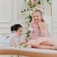模特朋友 129cm / 29kg,穿着杏粉色 M(110) 号,比日常尺码小两号。
