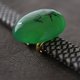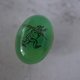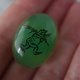 This piece features a beautiful, deep green agate, a natural stone, adorned with a charming and somewhat humorous frog from the classic Japanese "Choju-giga" (Scrolls of Frolicking Animals).