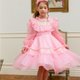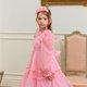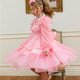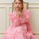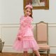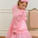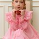 精致闪烁的 极光亮片刺绣、随光线变化色彩的 雪纺面料、柔美的 扇形蕾丝,以及带柔和珍珠感的 金属纱线——多种材质完美融合,营造更加 奢华与特别的氛围。蕾丝装饰与流动的荷叶边展现 波西米亚风格的时尚感,腰部配有 大蝴蝶结可调节设计,既舒适又优雅。整体采用 100% 清新粉色,带一抹珊瑚色,如同女孩脸颊上的水彩般生动明亮。