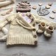 男嬰針織服裝套裝。毛衣、帽子、褲子和靴子。可以作為新生兒的禮物帶回家或洗禮。送給準父母的精美淋浴禮物是一份非常可愛的新媽媽或新爸爸禮物。