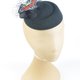 以刺繡和毛氈,搭配黑色 sinamay、頭紗及薄紗。黑色的毛氈基底約為 15 公分,透過髮夾固定於秀髮上。